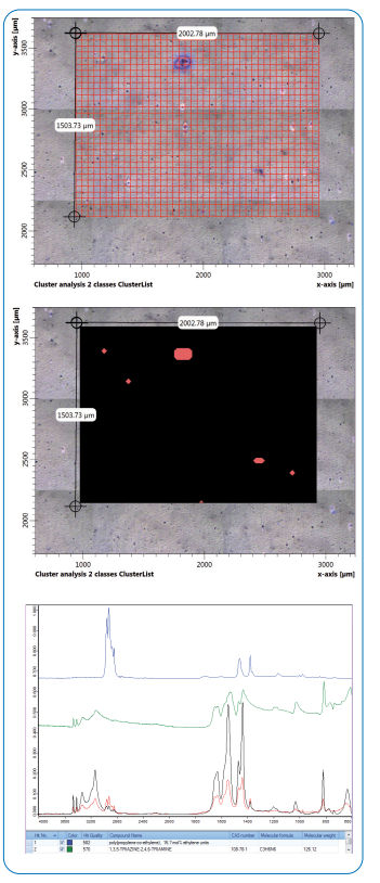 La microscopia FT-IR è un metodo interessante per l’analisi dei guasti. Permette di misurare uno spettro IR da strutture nell’ordine dei micrometri con un’elevata risoluzione laterale. Gli spettri IR forniscono informazioni sull’identità chimica dei difetti e consentono di distinguere tra i diversi strati. Con la microscopia FT-IR è possibile registrare un’immagine chimica del campione che mostra la sua composizione e la distribuzione del difetto.